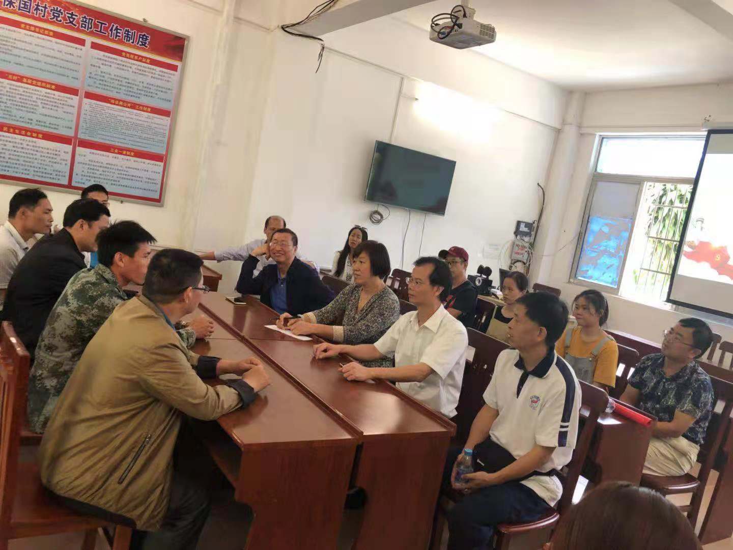 2018年11月23日,生态环境公司党委组织15名师生党员到公司帮扶单位五指山市畅好乡保国村开展“党建引领扶贫”主题党日活动,活动形式多样、内容丰富:1、开展实地调研。在驻村第一书记吕能标带领下,实地参观考察贫困户种植基地和养殖基地,了解保国村的产业发展情况,了解贫困户的生产生活情况:2、上党课。生态环境公司党务临时负责人钟声给保国村党支部全体党员上了一堂主题为“脱贫攻坚路上共产党员的担当意识”的党课,钟声希望在脱贫攻坚路上共产党员应该有担当意识,要懂担当、敢于担当、勇于担当、善于担当:3、召开座谈会。听取驻村第一书记吕能标和村支部书记黄成勇汇报近期党建工作与脱贫攻坚工作情况,与会人员就党建帮扶、产业发展、脱贫攻坚路上存在的问题与急需解决的困难等问题进行研讨;4、张贴宣传海报,学习宣传习近平总书记“4.13重要讲话精神”和习近平总书记关于“脱贫攻坚的重要论述”以及党的脱贫政策。